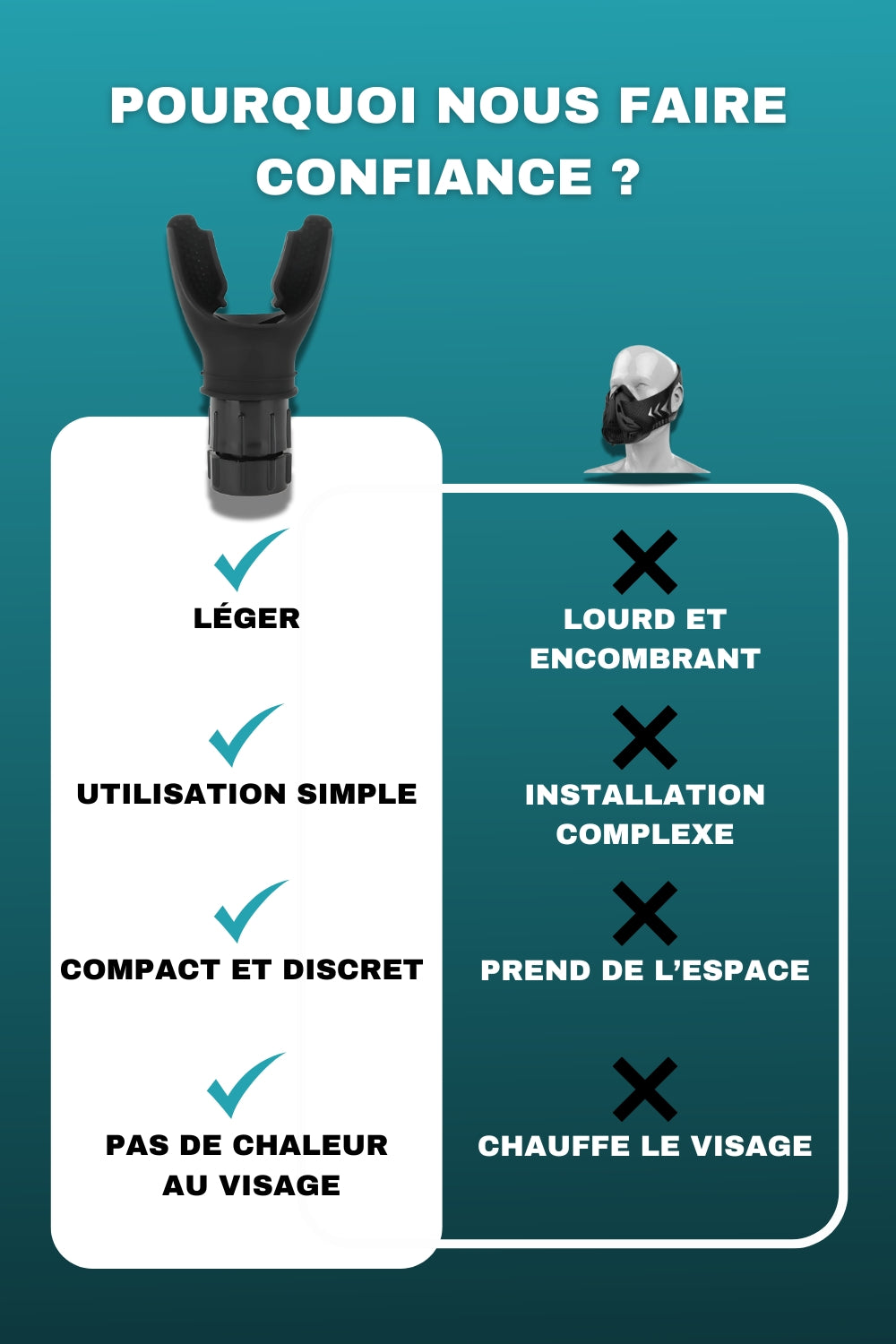Le MyCover ajoute un défi supplémentaire à votre respiration. Les différents niveau de résistance permettent de solliciter d'avantage vos muscles respiratoires, votre capacité pulmonaire est ainsi fortement améliorée.